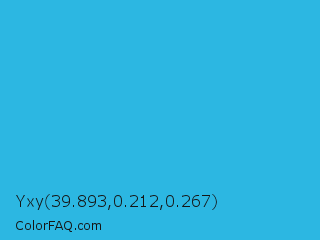 Yxy 39.893,0.212,0.267 Color is a normal blue color and the nearest color is Scooter #2ebfd4. Hex code #2cb7e2 and RGB value is rgb(44,183,226). In RGB color space, this color is composed of 17% red, 72% green, 89% blue, In CMYK color space, this color is composed of 81% cyan, 19% magenta, 0% yellow , 11% black , In HSL color space, this color has a hue angle of 194° , 76% saturation and 53% lightness.