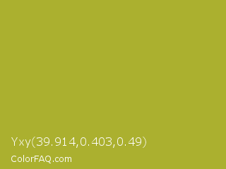 Yxy 39.914,0.403,0.49 Color is a normal yellow color and the nearest color is Citron #9fa91f. Hex code #abb02f and RGB value is rgb(171,176,47). In RGB color space, this color is composed of 67% red, 69% green, 18% blue, In CMYK color space, this color is composed of 3% cyan, 0% magenta, 73% yellow , 31% black , In HSL color space, this color has a hue angle of 62° , 58% saturation and 44% lightness.