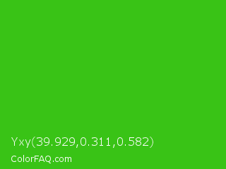 Yxy 39.929,0.311,0.582 Color is a normal green color and the nearest color is Harlequin Green #46cb18. Hex code #39c316 and RGB value is rgb(57,195,22). In RGB color space, this color is composed of 22% red, 76% green, 9% blue, In CMYK color space, this color is composed of 71% cyan, 0% magenta, 89% yellow , 24% black , In HSL color space, this color has a hue angle of 108° , 80% saturation and 43% lightness.
