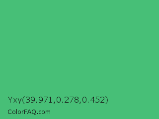 Yxy 39.971,0.278,0.452 Color is a normal green color and the nearest color is Emerald #50c878. Hex code #47bf77 and RGB value is rgb(71,191,119). In RGB color space, this color is composed of 28% red, 75% green, 47% blue, In CMYK color space, this color is composed of 63% cyan, 0% magenta, 38% yellow , 25% black , In HSL color space, this color has a hue angle of 144° , 48% saturation and 51% lightness.