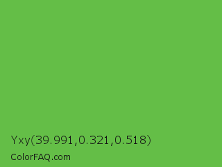 Yxy 39.991,0.321,0.518 Color is a normal green color and the nearest color is Green RYB #66b032. Hex code #64be47 and RGB value is rgb(100,190,71). In RGB color space, this color is composed of 39% red, 75% green, 28% blue, In CMYK color space, this color is composed of 47% cyan, 0% magenta, 63% yellow , 25% black , In HSL color space, this color has a hue angle of 105° , 48% saturation and 51% lightness.