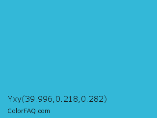 Yxy 39.996,0.218,0.282 Color is a normal cyan color and the nearest color is Scooter #2ebfd4. Hex code #33b8d8 and RGB value is rgb(51,184,216). In RGB color space, this color is composed of 20% red, 72% green, 85% blue, In CMYK color space, this color is composed of 76% cyan, 15% magenta, 0% yellow , 15% black , In HSL color space, this color has a hue angle of 192° , 68% saturation and 52% lightness.