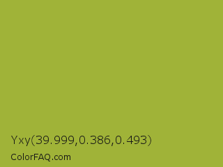 Yxy 39.999,0.386,0.493 Color is a normal yellow color and the nearest color is Android Green #a4c639. Hex code #a0b338 and RGB value is rgb(160,179,56). In RGB color space, this color is composed of 63% red, 70% green, 22% blue, In CMYK color space, this color is composed of 11% cyan, 0% magenta, 69% yellow , 30% black , In HSL color space, this color has a hue angle of 69° , 52% saturation and 46% lightness.