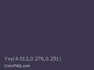 Yxy 4.012,0.276,0.251 Color is a dark indigo color and the nearest color is Martinique #363050. Hex code #3b354d and RGB value is rgb(59,53,77). In RGB color space, this color is composed of 23% red, 21% green, 30% blue, In CMYK color space, this color is composed of 23% cyan, 31% magenta, 0% yellow , 70% black , In HSL color space, this color has a hue angle of 255° , 18% saturation and 25% lightness.