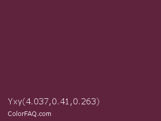 Yxy 4.037,0.41,0.263 Color is a dark rose color and the nearest color is Tawny Port #692545. Hex code #60233e and RGB value is rgb(96,35,62). In RGB color space, this color is composed of 38% red, 14% green, 24% blue, In CMYK color space, this color is composed of 0% cyan, 64% magenta, 35% yellow , 62% black , In HSL color space, this color has a hue angle of 333° , 47% saturation and 26% lightness.