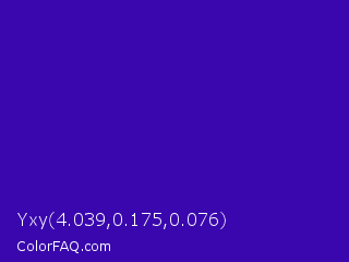 Yxy 4.039,0.175,0.076 Color is a normal indigo color and the nearest color is Interdimensional Blue #360ccc. Hex code #3907ad and RGB value is rgb(57,7,173). In RGB color space, this color is composed of 22% red, 3% green, 68% blue, In CMYK color space, this color is composed of 67% cyan, 96% magenta, 0% yellow , 32% black , In HSL color space, this color has a hue angle of 258° , 92% saturation and 35% lightness.