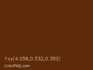 Yxy 4.058,0.532,0.393 Color is a very dark orange color and the nearest color is Seal Brown #59260b. Hex code #5e2a0a and RGB value is rgb(94,42,10). In RGB color space, this color is composed of 37% red, 16% green, 4% blue, In CMYK color space, this color is composed of 0% cyan, 55% magenta, 89% yellow , 63% black , In HSL color space, this color has a hue angle of 23° , 81% saturation and 20% lightness.