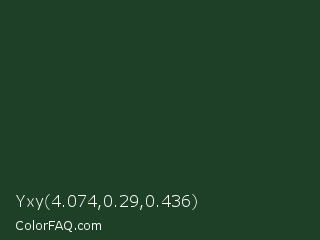 Yxy 4.074,0.29,0.436 Color is a very dark green color and the nearest color is Everglade #1c402e. Hex code #1d4027 and RGB value is rgb(29,64,39). In RGB color space, this color is composed of 11% red, 25% green, 15% blue, In CMYK color space, this color is composed of 55% cyan, 0% magenta, 39% yellow , 75% black , In HSL color space, this color has a hue angle of 137° , 38% saturation and 18% lightness.