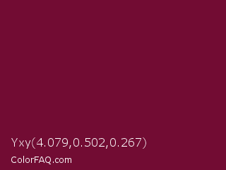 Yxy 4.079,0.502,0.267 Color is a dark rose color and the nearest color is Siren #7a013a. Hex code #720c33 and RGB value is rgb(114,12,51). In RGB color space, this color is composed of 45% red, 5% green, 20% blue, In CMYK color space, this color is composed of 0% cyan, 89% magenta, 55% yellow , 55% black , In HSL color space, this color has a hue angle of 337° , 81% saturation and 25% lightness.
