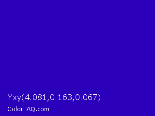 Yxy 4.081,0.163,0.067 Color is a normal indigo color and the nearest color is Interdimensional Blue #360ccc. Hex code #2c00ba and RGB value is rgb(44,0,186). In RGB color space, this color is composed of 17% red, 0% green, 73% blue, In CMYK color space, this color is composed of 76% cyan, 100% magenta, 0% yellow , 27% black , In HSL color space, this color has a hue angle of 254° , 100% saturation and 36% lightness.