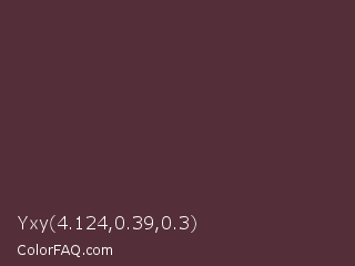 Yxy 4.124,0.39,0.3 Color is a dark rose color and the nearest color is Congo Brown #593737. Hex code #542e38 and RGB value is rgb(84,46,56). In RGB color space, this color is composed of 33% red, 18% green, 22% blue, In CMYK color space, this color is composed of 0% cyan, 45% magenta, 33% yellow , 67% black , In HSL color space, this color has a hue angle of 344° , 29% saturation and 25% lightness.