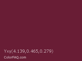 Yxy 4.139,0.465,0.279 Color is a dark rose color and the nearest color is Wine Berry #591d35. Hex code #691d35 and RGB value is rgb(105,29,53). In RGB color space, this color is composed of 41% red, 11% green, 21% blue, In CMYK color space, this color is composed of 0% cyan, 72% magenta, 50% yellow , 59% black , In HSL color space, this color has a hue angle of 341° , 57% saturation and 26% lightness.