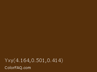 Yxy 4.164,0.501,0.414 Color is a very dark orange color and the nearest color is Cioccolato #55280c. Hex code #57300b and RGB value is rgb(87,48,11). In RGB color space, this color is composed of 34% red, 19% green, 4% blue, In CMYK color space, this color is composed of 0% cyan, 45% magenta, 87% yellow , 66% black , In HSL color space, this color has a hue angle of 29° , 78% saturation and 19% lightness.