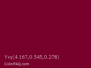 Yxy 4.167,0.545,0.278 Color is a dark rose color and the nearest color is Burgundy #800020. Hex code #78002b and RGB value is rgb(120,0,43). In RGB color space, this color is composed of 47% red, 0% green, 17% blue, In CMYK color space, this color is composed of 0% cyan, 100% magenta, 64% yellow , 53% black , In HSL color space, this color has a hue angle of 339° , 100% saturation and 24% lightness.