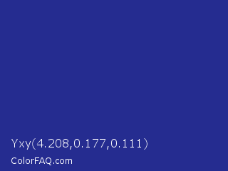 Yxy 4.208,0.177,0.111 Color is a normal blue color and the nearest color is Cosmic Cobalt #2e2d88. Hex code #252c90 and RGB value is rgb(37,44,144). In RGB color space, this color is composed of 15% red, 17% green, 56% blue, In CMYK color space, this color is composed of 74% cyan, 69% magenta, 0% yellow , 44% black , In HSL color space, this color has a hue angle of 236° , 59% saturation and 35% lightness.
