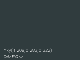 Yxy 4.208,0.283,0.322 Color is a very dark cyan color and the nearest color is Outer Space Crayola #2d383a. Hex code #303c3e and RGB value is rgb(48,60,62). In RGB color space, this color is composed of 19% red, 24% green, 24% blue, In CMYK color space, this color is composed of 23% cyan, 3% magenta, 0% yellow , 76% black , In HSL color space, this color has a hue angle of 189° , 13% saturation and 22% lightness.