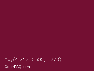 Yxy 4.217,0.506,0.273 Color is a dark rose color and the nearest color is Claret #7f1734. Hex code #730f32 and RGB value is rgb(115,15,50). In RGB color space, this color is composed of 45% red, 6% green, 20% blue, In CMYK color space, this color is composed of 0% cyan, 87% magenta, 57% yellow , 55% black , In HSL color space, this color has a hue angle of 339° , 77% saturation and 25% lightness.