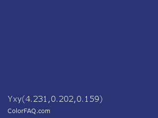 Yxy 4.231,0.202,0.159 Color is a normal blue color and the nearest color is Astronaut #283a77. Hex code #2b3474 and RGB value is rgb(43,52,116). In RGB color space, this color is composed of 17% red, 20% green, 45% blue, In CMYK color space, this color is composed of 63% cyan, 55% magenta, 0% yellow , 55% black , In HSL color space, this color has a hue angle of 233° , 46% saturation and 31% lightness.
