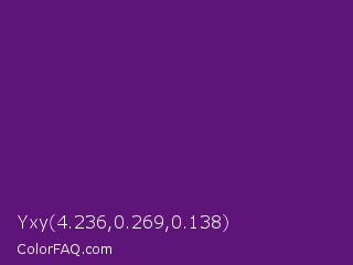 Yxy 4.236,0.269,0.138 Color is a dark purple color and the nearest color is Honey Flower #4f1c70. Hex code #5e1478 and RGB value is rgb(94,20,120). In RGB color space, this color is composed of 37% red, 8% green, 47% blue, In CMYK color space, this color is composed of 22% cyan, 83% magenta, 0% yellow , 53% black , In HSL color space, this color has a hue angle of 284° , 71% saturation and 27% lightness.