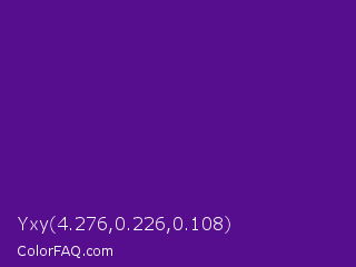Yxy 4.276,0.226,0.108 Color is a normal purple color and the nearest color is Pigment Indigo #4b0082. Hex code #560e8f and RGB value is rgb(86,14,143). In RGB color space, this color is composed of 34% red, 5% green, 56% blue, In CMYK color space, this color is composed of 40% cyan, 90% magenta, 0% yellow , 44% black , In HSL color space, this color has a hue angle of 273° , 82% saturation and 31% lightness.