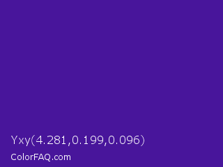 Yxy 4.281,0.199,0.096 Color is a normal violet color and the nearest color is Daisy Bush #4f2398. Hex code #48159b and RGB value is rgb(72,21,155). In RGB color space, this color is composed of 28% red, 8% green, 61% blue, In CMYK color space, this color is composed of 54% cyan, 86% magenta, 0% yellow , 39% black , In HSL color space, this color has a hue angle of 263° , 76% saturation and 35% lightness.