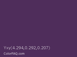 Yxy 4.294,0.292,0.207 Color is a dark purple color and the nearest color is Bossanova #4e2a5a. Hex code #4f2d5b and RGB value is rgb(79,45,91). In RGB color space, this color is composed of 31% red, 18% green, 36% blue, In CMYK color space, this color is composed of 13% cyan, 51% magenta, 0% yellow , 64% black , In HSL color space, this color has a hue angle of 284° , 34% saturation and 27% lightness.