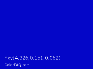 Yxy 4.326,0.151,0.062 Color is a normal blue color and the nearest color is Dark Blue #0000c8. Hex code #0406c8 and RGB value is rgb(4,6,200). In RGB color space, this color is composed of 2% red, 2% green, 78% blue, In CMYK color space, this color is composed of 98% cyan, 97% magenta, 0% yellow , 22% black , In HSL color space, this color has a hue angle of 239° , 96% saturation and 40% lightness.