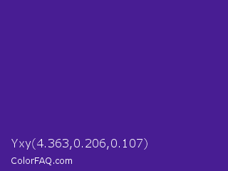 Yxy 4.363,0.206,0.107 Color is a normal violet color and the nearest color is Daisy Bush #4f2398. Hex code #481d93 and RGB value is rgb(72,29,147). In RGB color space, this color is composed of 28% red, 11% green, 58% blue, In CMYK color space, this color is composed of 51% cyan, 80% magenta, 0% yellow , 42% black , In HSL color space, this color has a hue angle of 262° , 67% saturation and 35% lightness.