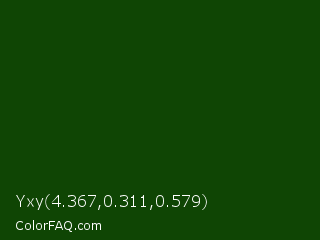 Yxy 4.367,0.311,0.579 Color is a very dark green color and the nearest color is Dark Fern #0a480d. Hex code #0f4504 and RGB value is rgb(15,69,4). In RGB color space, this color is composed of 6% red, 27% green, 2% blue, In CMYK color space, this color is composed of 78% cyan, 0% magenta, 94% yellow , 73% black , In HSL color space, this color has a hue angle of 110° , 89% saturation and 14% lightness.