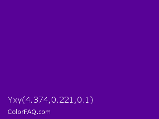 Yxy 4.374,0.221,0.1 Color is a dark purple color and the nearest color is Purple #660099. Hex code #580297 and RGB value is rgb(88,2,151). In RGB color space, this color is composed of 35% red, 1% green, 59% blue, In CMYK color space, this color is composed of 42% cyan, 99% magenta, 0% yellow , 41% black , In HSL color space, this color has a hue angle of 275° , 97% saturation and 30% lightness.