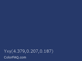 Yxy 4.379,0.207,0.187 Color is a dark blue color and the nearest color is Rhino #2e3f62. Hex code #26396a and RGB value is rgb(38,57,106). In RGB color space, this color is composed of 15% red, 22% green, 42% blue, In CMYK color space, this color is composed of 64% cyan, 46% magenta, 0% yellow , 58% black , In HSL color space, this color has a hue angle of 223° , 47% saturation and 28% lightness.