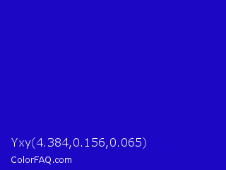 Yxy 4.384,0.156,0.065 Color is a normal indigo color and the nearest color is Interdimensional Blue #360ccc. Hex code #1c07c4 and RGB value is rgb(28,7,196). In RGB color space, this color is composed of 11% red, 3% green, 77% blue, In CMYK color space, this color is composed of 86% cyan, 96% magenta, 0% yellow , 23% black , In HSL color space, this color has a hue angle of 247° , 93% saturation and 40% lightness.