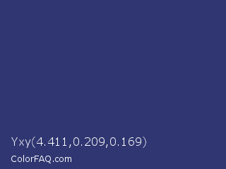 Yxy 4.411,0.209,0.169 Color is a normal blue color and the nearest color is Astronaut #283a77. Hex code #2f3671 and RGB value is rgb(47,54,113). In RGB color space, this color is composed of 18% red, 21% green, 44% blue, In CMYK color space, this color is composed of 58% cyan, 52% magenta, 0% yellow , 56% black , In HSL color space, this color has a hue angle of 234° , 41% saturation and 31% lightness.