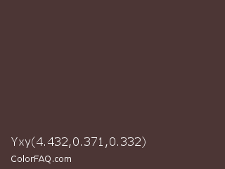 Yxy 4.432,0.371,0.332 Color is a dark red color and the nearest color is Rock #4d3833. Hex code #4c3635 and RGB value is rgb(76,54,53). In RGB color space, this color is composed of 30% red, 21% green, 21% blue, In CMYK color space, this color is composed of 0% cyan, 29% magenta, 30% yellow , 70% black , In HSL color space, this color has a hue angle of 3° , 18% saturation and 25% lightness.