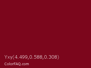 Yxy 4.499,0.588,0.308 Color is a dark red color and the nearest color is Burgundy #800020. Hex code #7c061c and RGB value is rgb(124,6,28). In RGB color space, this color is composed of 49% red, 2% green, 11% blue, In CMYK color space, this color is composed of 0% cyan, 95% magenta, 77% yellow , 51% black , In HSL color space, this color has a hue angle of 349° , 91% saturation and 25% lightness.