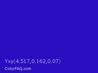 Yxy 4.517,0.162,0.07 Color is a normal indigo color and the nearest color is Interdimensional Blue #360ccc. Hex code #290dbf and RGB value is rgb(41,13,191). In RGB color space, this color is composed of 16% red, 5% green, 75% blue, In CMYK color space, this color is composed of 79% cyan, 93% magenta, 0% yellow , 25% black , In HSL color space, this color has a hue angle of 249° , 87% saturation and 40% lightness.