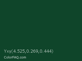 Yxy 4.525,0.269,0.444 Color is a very dark green color and the nearest color is Sherwood Green #02402c. Hex code #0f452a and RGB value is rgb(15,69,42). In RGB color space, this color is composed of 6% red, 27% green, 16% blue, In CMYK color space, this color is composed of 78% cyan, 0% magenta, 39% yellow , 73% black , In HSL color space, this color has a hue angle of 150° , 64% saturation and 16% lightness.