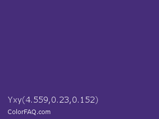 Yxy 4.559,0.23,0.152 Color is a normal indigo color and the nearest color is Minsk #3f307f. Hex code #462d79 and RGB value is rgb(70,45,121). In RGB color space, this color is composed of 27% red, 18% green, 47% blue, In CMYK color space, this color is composed of 42% cyan, 63% magenta, 0% yellow , 53% black , In HSL color space, this color has a hue angle of 260° , 46% saturation and 33% lightness.