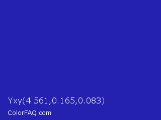 Yxy 4.561,0.165,0.083 Color is a normal indigo color and the nearest color is Persian Blue #1c39bb. Hex code #2421b0 and RGB value is rgb(36,33,176). In RGB color space, this color is composed of 14% red, 13% green, 69% blue, In CMYK color space, this color is composed of 80% cyan, 81% magenta, 0% yellow , 31% black , In HSL color space, this color has a hue angle of 241° , 68% saturation and 41% lightness.