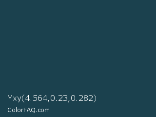 Yxy 4.564,0.23,0.282 Color is a very dark blue color and the nearest color is Blue Dianne #204852. Hex code #1b414e and RGB value is rgb(27,65,78). In RGB color space, this color is composed of 11% red, 25% green, 31% blue, In CMYK color space, this color is composed of 65% cyan, 17% magenta, 0% yellow , 69% black , In HSL color space, this color has a hue angle of 195° , 49% saturation and 21% lightness.