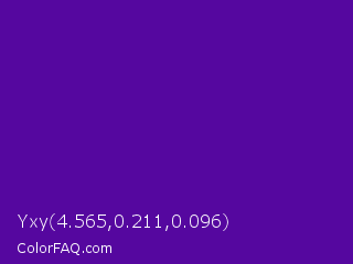 Yxy 4.565,0.211,0.096 Color is a normal purple color and the nearest color is Purple #660099. Hex code #55079f and RGB value is rgb(85,7,159). In RGB color space, this color is composed of 33% red, 3% green, 62% blue, In CMYK color space, this color is composed of 47% cyan, 96% magenta, 0% yellow , 38% black , In HSL color space, this color has a hue angle of 271° , 92% saturation and 33% lightness.