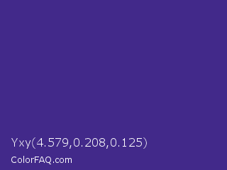 Yxy 4.579,0.208,0.125 Color is a normal indigo color and the nearest color is Spanish Violet #4c2882. Hex code #42298a and RGB value is rgb(66,41,138). In RGB color space, this color is composed of 26% red, 16% green, 54% blue, In CMYK color space, this color is composed of 52% cyan, 70% magenta, 0% yellow , 46% black , In HSL color space, this color has a hue angle of 255° , 54% saturation and 35% lightness.