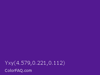 Yxy 4.579,0.221,0.112 Color is a normal violet color and the nearest color is Daisy Bush #4f2398. Hex code #531991 and RGB value is rgb(83,25,145). In RGB color space, this color is composed of 33% red, 10% green, 57% blue, In CMYK color space, this color is composed of 43% cyan, 83% magenta, 0% yellow , 43% black , In HSL color space, this color has a hue angle of 269° , 71% saturation and 33% lightness.