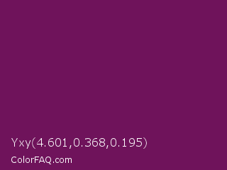 Yxy 4.601,0.368,0.195 Color is a dark magenta color and the nearest color is French Plum #811453. Hex code #6f135b and RGB value is rgb(111,19,91). In RGB color space, this color is composed of 44% red, 7% green, 36% blue, In CMYK color space, this color is composed of 0% cyan, 83% magenta, 18% yellow , 56% black , In HSL color space, this color has a hue angle of 313° , 71% saturation and 25% lightness.