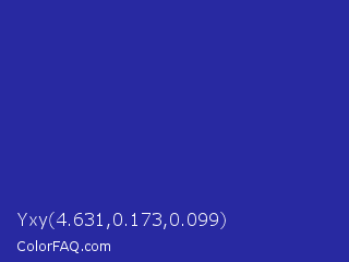 Yxy 4.631,0.173,0.099 Color is a normal blue color and the nearest color is Blue Pigment #333399. Hex code #2829a1 and RGB value is rgb(40,41,161). In RGB color space, this color is composed of 16% red, 16% green, 63% blue, In CMYK color space, this color is composed of 75% cyan, 75% magenta, 0% yellow , 37% black , In HSL color space, this color has a hue angle of 240° , 60% saturation and 39% lightness.