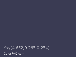 Yxy 4.652,0.265,0.254 Color is a dark blue color and the nearest color is Bright Gray #3c4151. Hex code #3a3b53 and RGB value is rgb(58,59,83). In RGB color space, this color is composed of 23% red, 23% green, 33% blue, In CMYK color space, this color is composed of 30% cyan, 29% magenta, 0% yellow , 67% black , In HSL color space, this color has a hue angle of 238° , 18% saturation and 28% lightness.