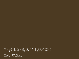Yxy 4.678,0.411,0.402 Color is a very dark orange color and the nearest color is Black Coffee #4b3621. Hex code #4c3a22 and RGB value is rgb(76,58,34). In RGB color space, this color is composed of 30% red, 23% green, 13% blue, In CMYK color space, this color is composed of 0% cyan, 24% magenta, 55% yellow , 70% black , In HSL color space, this color has a hue angle of 34° , 38% saturation and 22% lightness.