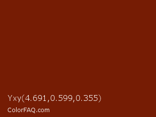 Yxy 4.691,0.599,0.355 Color is a dark red color and the nearest color is Kenyan Copper #7c1c05. Hex code #761c04 and RGB value is rgb(118,28,4). In RGB color space, this color is composed of 46% red, 11% green, 2% blue, In CMYK color space, this color is composed of 0% cyan, 76% magenta, 97% yellow , 54% black , In HSL color space, this color has a hue angle of 13° , 93% saturation and 24% lightness.