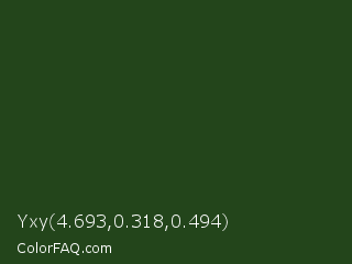 Yxy 4.693,0.318,0.494 Color is a very dark green color and the nearest color is Green House #24500f. Hex code #23451b and RGB value is rgb(35,69,27). In RGB color space, this color is composed of 14% red, 27% green, 11% blue, In CMYK color space, this color is composed of 49% cyan, 0% magenta, 61% yellow , 73% black , In HSL color space, this color has a hue angle of 109° , 44% saturation and 19% lightness.