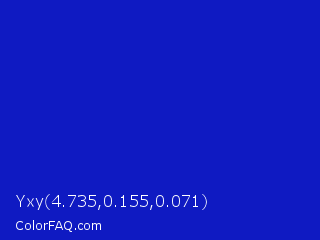 Yxy 4.735,0.155,0.071 Color is a normal blue color and the nearest color is Blue Pantone #0018a8. Hex code #0f1ac2 and RGB value is rgb(15,26,194). In RGB color space, this color is composed of 6% red, 10% green, 76% blue, In CMYK color space, this color is composed of 92% cyan, 87% magenta, 0% yellow , 24% black , In HSL color space, this color has a hue angle of 236° , 86% saturation and 41% lightness.